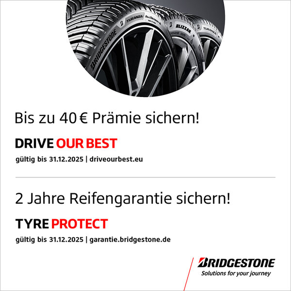 Mindestens zwei Bridgestone Reifen kaufen und bis zu 40.– € Kaufprämie sichern.